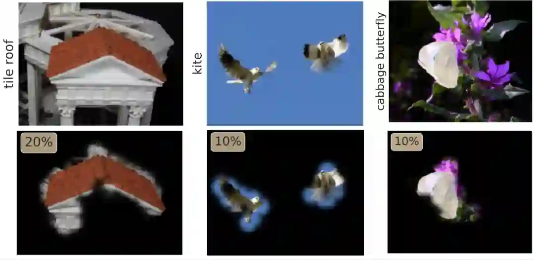 与人类视觉相似,神经网络往往可以通过仅仅处理图像中与任务相关的一小部分区域而得到正确的结果,例如在下图中,遮挡住屋顶、飞鸟或花朵之外的部分,神经网络仍然可以得到正确的分类结果: