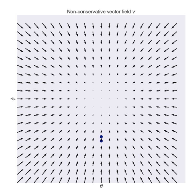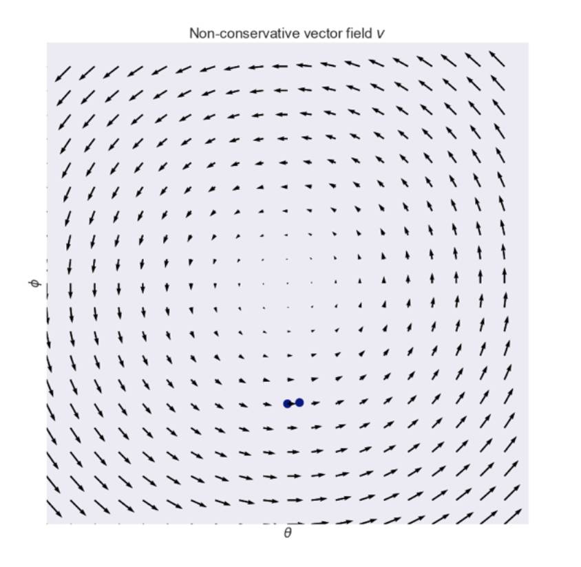 这个向量场在零和游戏中经常出现(译者注:zero-sum game就是指“零和博弈”,指参与博弈的各方,在严格竞争下,一方的收益必然意味着另一方的损失,博弈各方的收益和损失相加总和永远为“零”,双方不存在合作的可能),其中