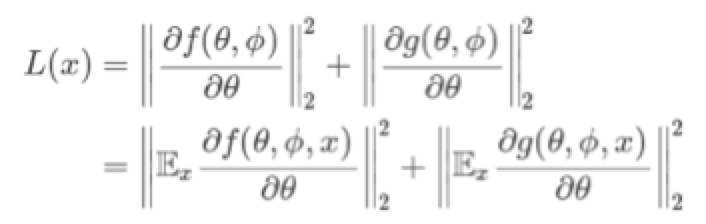 我想再提一下这篇文章中没有讨论的一种方法,但是我认为对于任何想要达成一致优化效果的学者来说都是非常重要的:我们如何通过随机优化和小批量来实现的?虽然本文是在讲一般的应用场景,在对抗生成网络中,f和g实际上是数据点之间的一些回报的平均值,例如,这样对于L我们有如下表达式: