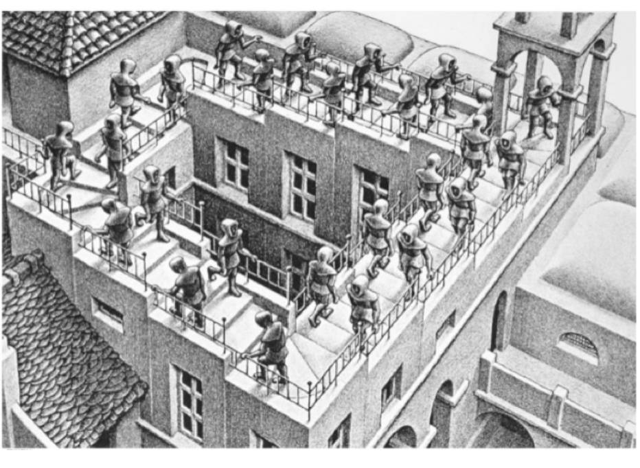可以把此矢量比作与埃舍尔的《不可思议城堡》(译者注:埃舍尔,荷兰 版画家,因其绘画中的数学性而闻名,有兴趣的可以看看《不可能存在的存在》:http://www.360doc.com/content/17/0705/08/27794381_668875548.shtml)。在埃舍尔的“不可能存在的城堡”中,仆人认为他们正在上台阶或者是在下台阶,但实际上他们所做的都是围绕着圈子。当然如果要将Escher的城堡构建成是一个真正的3D 模型则是不可能的。类似地,不可能将卷积矢量场表示为标量函数的梯度。