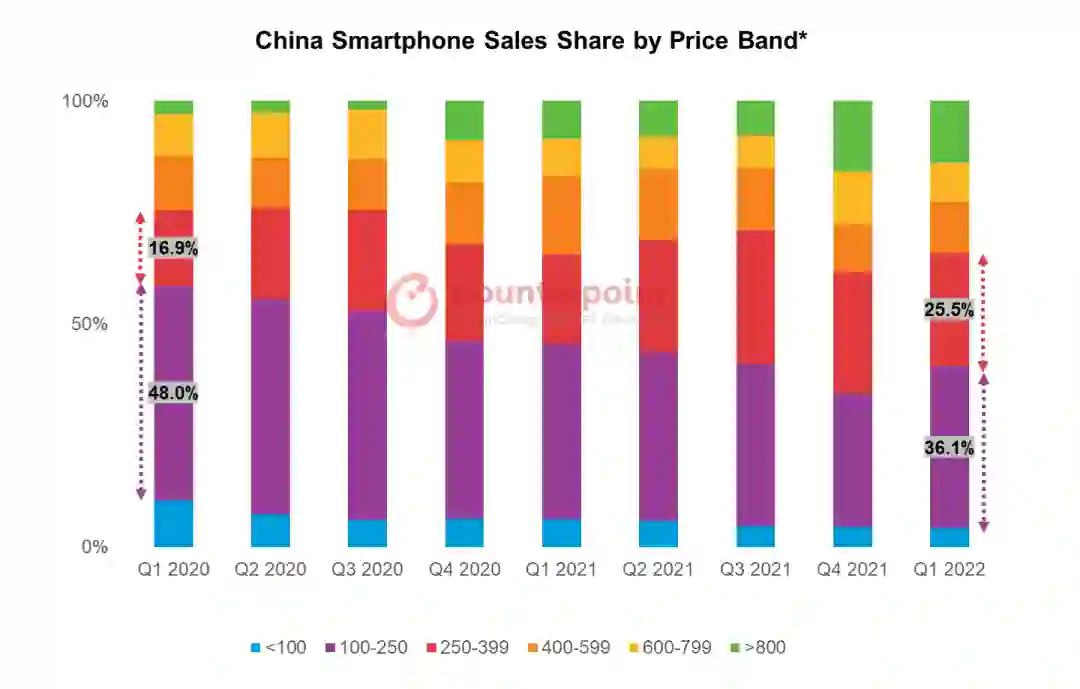 据 Counterpoint Research 今年发布的一份报告,中国智能手机市场最大头的部分来自 100-250 美元及 250-399 美元区间,而后者的占比在不断扩大,也就是 1700-2700 元上下。厂商也察觉到这一趋势,在这个区间发力,应对消费者的不断增长的功能需求。
