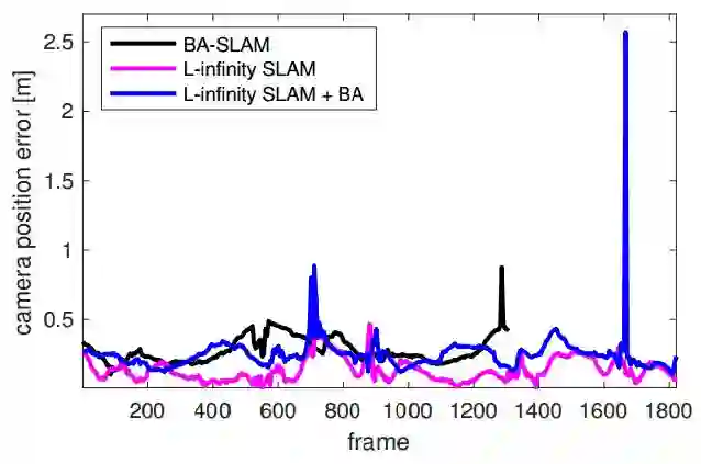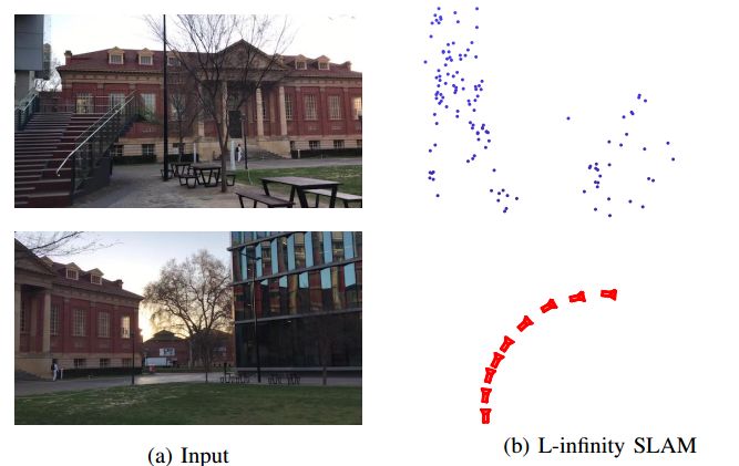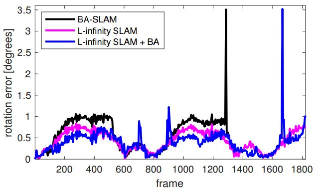 有些读者可能会发现,在L-infinity SLAM中,变量的估计是分离的,这令人不安。首先,请注意,我们并没有声明算法总所有变量中都是全局最优的。其次,有充分的证据证明旋转平均算法能够独立于位置和3D点产生高度精确的方向估计。而且位置和3D点的拟凸估计是全局最优的,因此算法整体精度将很高。