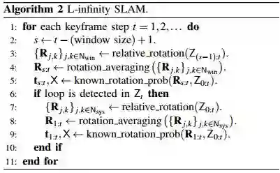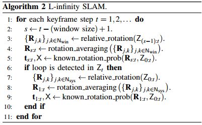 我们提出了一个L-infinity SLAM系统,如Algorithm 2所示。我们的算法最大的不同是开发出了使用平均旋转先估计出相机的旋转,然后根据旋转估计相机的位置和3D地图。