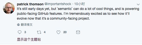 semantic 是一个用于解析、分析和对比不同语言源代码的 Haskell 库和命令行工具,目前支持 JavaScript、TypeScript、Python、Ruby 和 Go 语言。根据 GitHub Semantic Code 团队成员 patrick thomson 的 twitter 评论,未来该库可能会增加对 C 语言的支持。