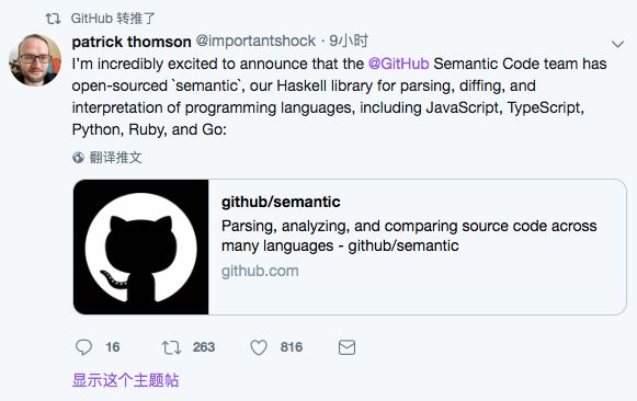 刚刚,GitHub Semantic Code 团队宣布开源 semantic 库。这是一个 Haskell 库,用于解析、对比、解释多种编程语言,目前该库支持 JavaScript、TypeScript、Python、Ruby 和 Go 等多种语言。