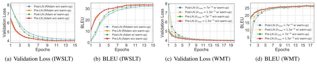 在 IWSLT、WMT 和 BERT 三个任务上验证了是否可以在 Pre-LN 结构中去掉 warm-up: