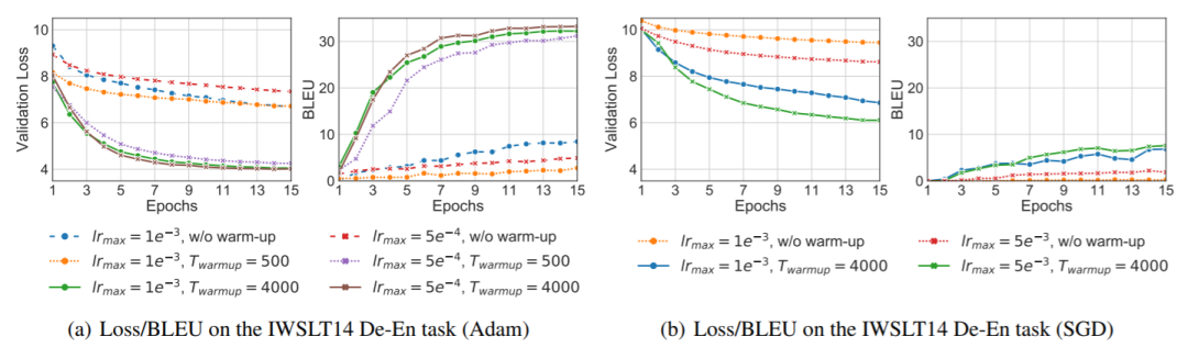我们在 IWSLT14 De-En 翻译数据集上使用 Transformer 模型对这一观点进行验证,采用 Adam 和 SGD 两种随机优化器,分别测试了两种学习率(1e^-3, 5e^-4)在没有 warm-up(0轮), warm-up 迭代轮数不足(500轮)和迭代轮数充足(4000轮)情况下模型的验证集 Loss 与 BLEU 分数。