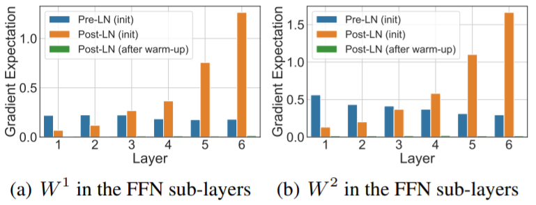 可以看出,相比于 Post-LN 结构梯度分布的不稳定,Pre-LN 在各层之间梯度范数几乎保持不变,这种结构明显更利于优化器进行优化。而在进行一定轮数的 warm-up 后,Post-LN 的梯度范数也基本保持不变,并且其量级非常小(图4中绿色),这也验证了我们的结论。