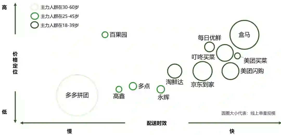 图4把所有生鲜电商模式按核心年龄段、配送时效、价格定位、线上单量规模等指标放一起比较,盒马在切青年人群(18-39岁)上一骑绝尘,而社区团购主打的低价平质生鲜切中了高频买菜人群(30-60岁)。