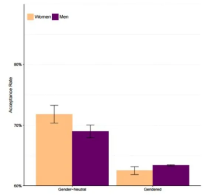 与这项调查类似的是,没有任何被主流学界接受的科学证据表明,女性的编程能力比男性更差。但是当女性编程者透露自己的性别时,奇怪的事情发生了。例如,一项针对 140 万名 Github 用户的研究表明,如果一名女性用户在个人资料里说明自己的性别,当她向从未合作过的其他用户发送 pull request 的时候,得到接受的概率会显著降低。