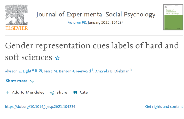 这篇文章题为 Gender representation cues labels of hard and soft sciences,发表在心理学期刊 Journal of Experimental Social Psychology 上。