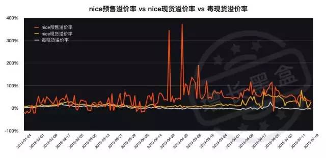 可以看出,nice的现货溢价率与毒的现货溢价率基本接近,但nice的预售溢价率波动非常大,最高的时候超过350%的溢价率。