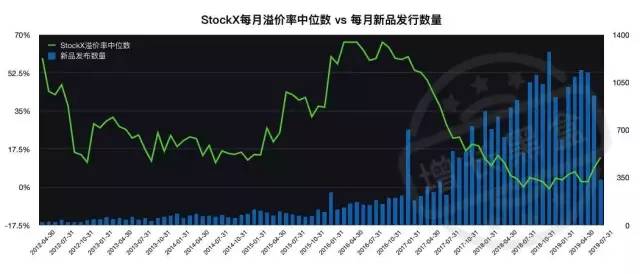 可以看出,StockX近一年的溢价率相对稳定,多数时间保持在0%-20%之间,在2019年1月、6月、7月间有所上涨。