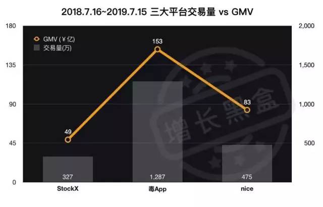 通过对比三大平台从2018年7月至2019年7月近一年的交易量和GMV,我们可以发现毒App的交易量和GMV均是StockX的3倍。