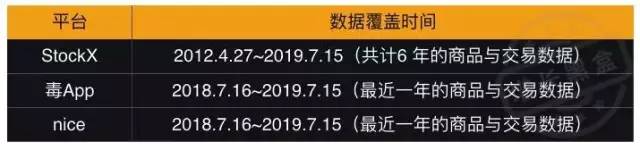 为了还原球鞋转卖交易市场的真实情况,我们此次分析使用了 StockX、毒App、nice 三大平台 App 端的所有可见公开数据,总计约11万条商品数据以及2242万条交易记录。