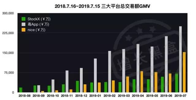 其中StockX增速最缓慢但是平稳;nice在2019年初GMV开始反超StockX,而后nice在资本的加持下,7月份以超过200%的速度增长,已隐隐有在GMV上赶超毒App的势头。