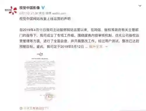 昨日晚间,视觉中国影像官方微博发文称,整改已达到预期目标,定于2019年5月12日零点开始恢复网站上线运营,开始向客户全面提供服务。