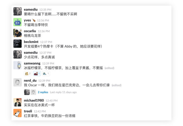 工作上最重要的 App 是 Slack、Quip、Trello 和 Todoist。我们团队里用 Slack 来进行交流,Slack 的好处是可以设置多个频道,让不同类型的聊天内容区分开,比如运营和开发是不同的频道,iOS 客户端和 Workflow Gallery 是不同的频道。频道相隔开但又不完全切断,不直接相关的项目之间偶尔也可以串串门。Slack 的通知设置也很灵活,你可以单独为某个频道设置提醒,还可以设置关键词高亮等功能。另外 Slack 还非常有趣,可以针对单条消息进行 Thread 回复,还可以用 Emoji 回复,很好玩。