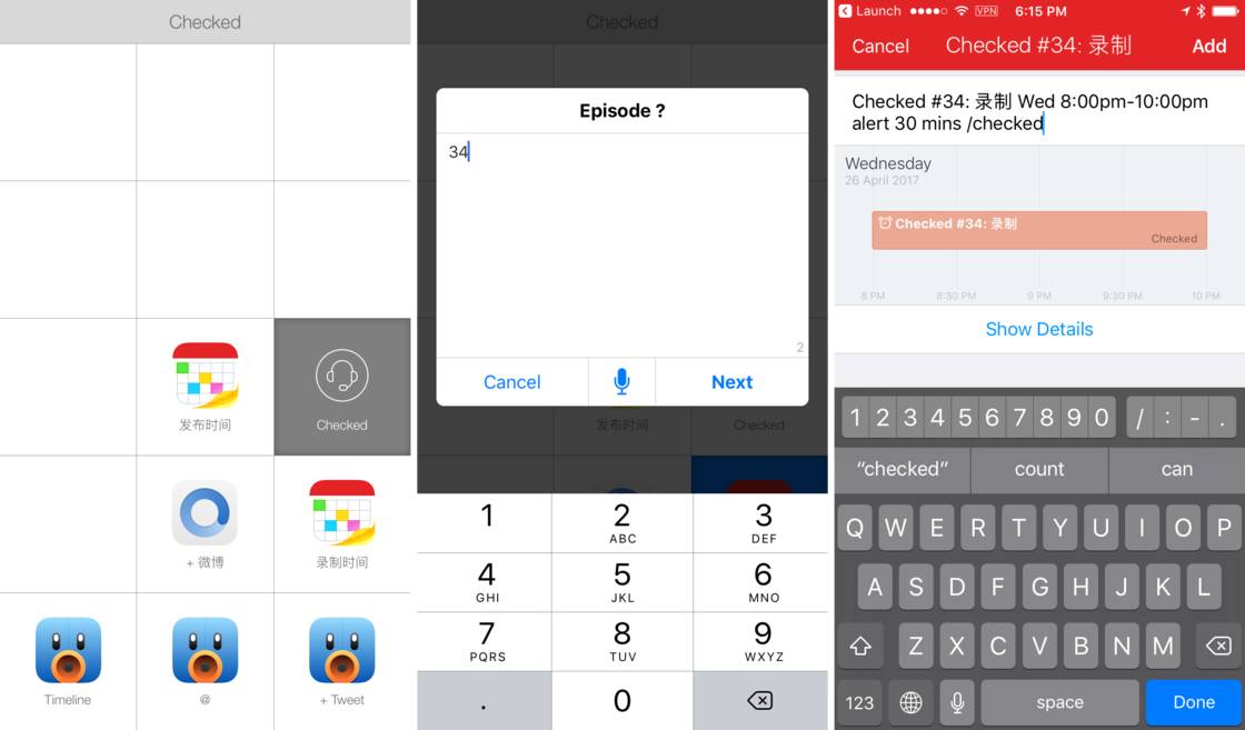 另外我也喜欢用 Launch Center Pro 预置一些模板,「Due Templates」和「Checked」里都是模板,基本原理都是预先填好 URL Scheme 和内容,然后发送到具体 App,对于可能会发生变化的因素,也可以在过程中进行输入。比如「Checked」分组里有个叫「录制时间」的动作,事件名称(Checked #XX: 录制)、录制时间(8:30–10:30)、提醒时间(半小时前)、日历分类(Checked)这几个因素是固定的,就可以预先填好。像节目期数和录制日期是变动的,就可以在过程中手动输入。