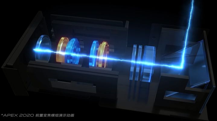 APEX 2020 的光学变焦镜头采用了“4群组镜片组合”,也就是两个群组固定,两个群组可移动,能同时实现高倍率连续变焦和实时对焦功能,潜望式设计则让镜头在保证功能性的前提下,机身依旧纤薄。