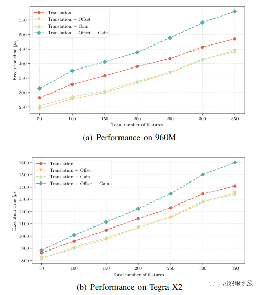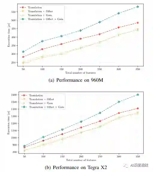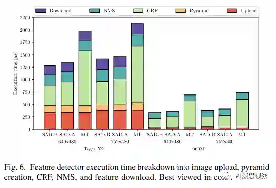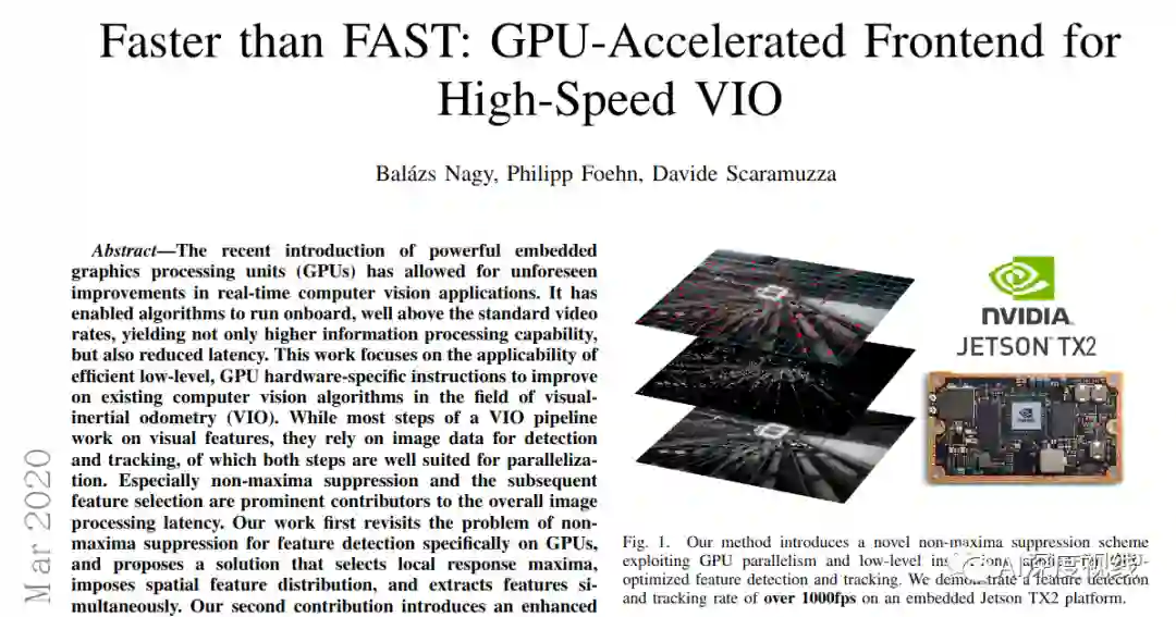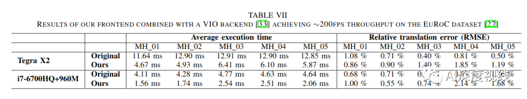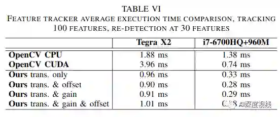 最后,与其他最新的CPU和GPU实现进行了比较,在特征跟踪和检测方面始终优于所有其他实现,从而在嵌入式Jetson TX2平台上实现了超过1000 FPS。此外,我们展示了我们的工作已集成到VIO管道中,以约200fps的速度实现了姿态评估。