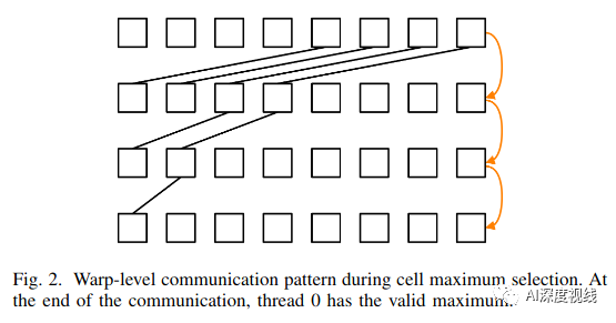 作者将角点响应图分为规则的单元格网格。为了简化说明,在32x32单元中使用了1:1的warp-to-cell映射。
