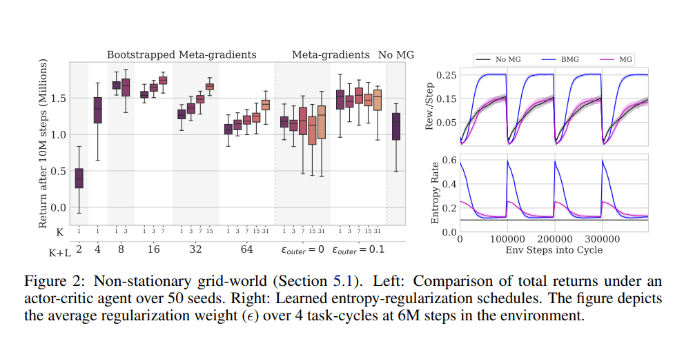 非稳态网格世界(第 5.1 节)左:在超过 50 个随机种子之中,演员 - 评价者代理下的总回报对比。右:学习的熵值 - 正则化的时间表。