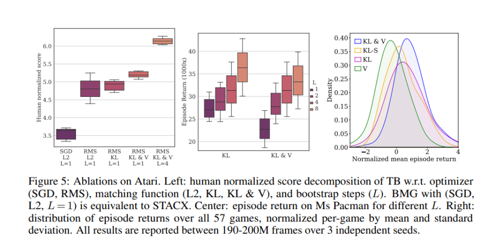 Atari 的消融实验。左:人类标准化得分分解,优化器(SGD,RMS),匹配函数(L2,KL,KL&V),以及引导式步骤(L)。BMG 在(SGD,L2,L=1)的情况下与 STACX 相同。中:不同 L 下吃豆人关卡返回。右:在 57 种游戏中关卡返回的分布,按照平均值和标准偏差对每种游戏进行标准化处理。所有结果均为三个独立随机种子,1.9-2 亿帧之间观察所得。