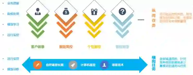 这里是很多AI垂直项目,比如做用户画像、做用户的KYC、做风控、做智能问答即聊天机器人,很多纵向的项目有建模、标注、模型训练、监控等,都是可以抽象变成水平化的步骤。