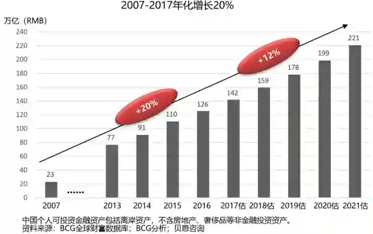 从上图也可以看得出来,从2007到2016年,十年左右的时间中国财富管理市场规模、财富资产总规模是以年化20%的复利在增长。过去几年,从2016年到2018年增长率大概12%,未来几年中,预期也是双位数的增长。