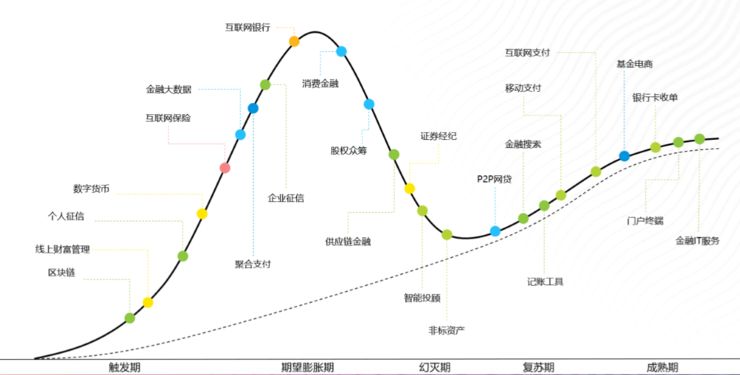 看一下Gartner技术曲线,不同的金融科技在这个曲线上所处的位置是不一样的,以前的基金电商、证券经纪、股权众筹、消费金融等,已经是在高中期之后了。