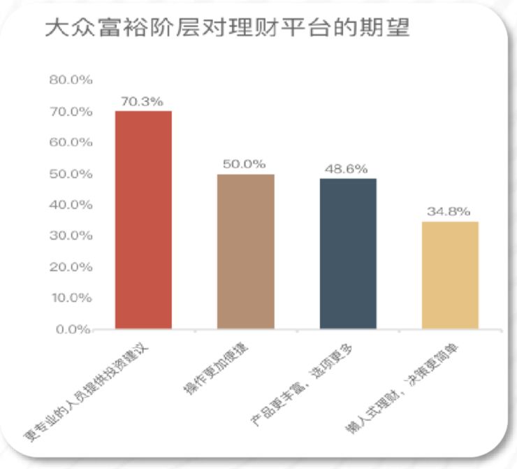 而大众富裕阶层他们的第一款投资理财产品通常就是在线上购买的,比如在大型电商、金融板块的网站、金融机构的APP、专属投资理财机构的APP等,同时他们的美港股、A股等股票交易行为也是在线上发生的。因此这群人对线上理财投资、线上智能化财富管理有着天生的需求,同时也非常期待。