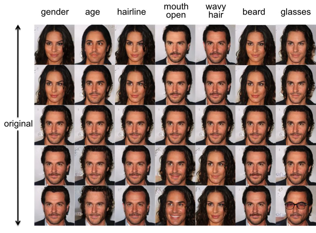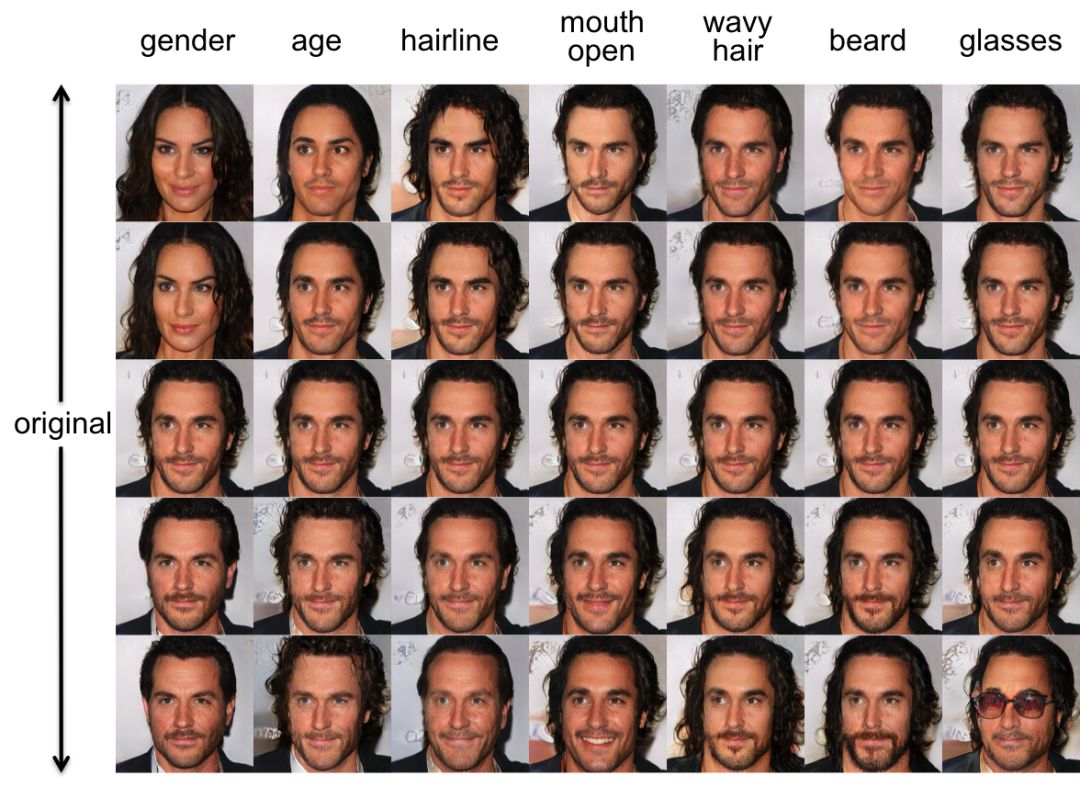 风格迁移,以 CycleGAN 和 pix2pix 为代表,是用来将图像从一个领域迁移到另一领域(例如,从马到斑马,从素描到彩色图像)的模型。因此,我们不能在两个离散状态之间连续调整一个特征(例如,在脸上添加更多胡须)。另外,一个网络专用于一种类型的迁移,因此调整 10 个特征需要十个不同的神经网络。