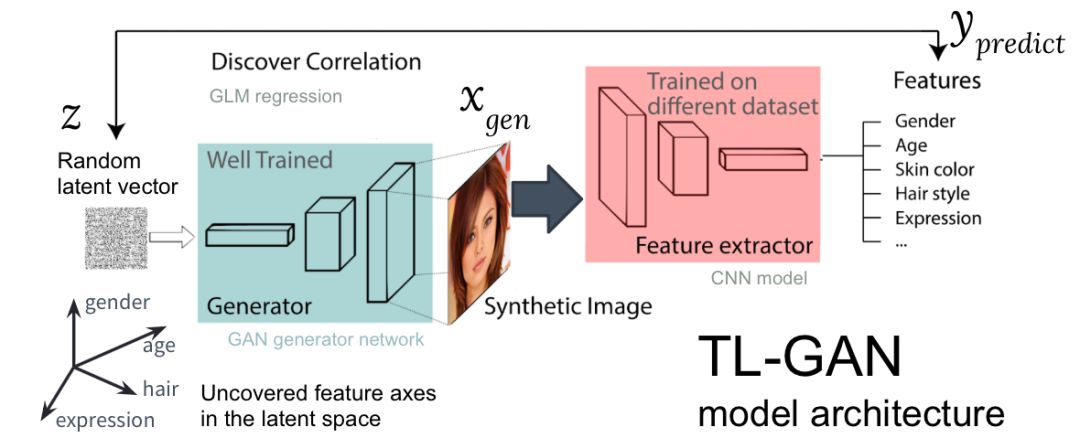 为了解决该问题,TL-GAN 模型做出了一项重要创新,即利用已有标注图像数据集 (x_real, y_real) 训练单独的特征提取器(用于离散标签的分类器或用于连续标签的回归器)模型 y=F(x),然后将训练好的 GAN 生成器 G 与特征提取器网络 F 结合起来。这样,我们就能利用训练好的特征提取器网络来预测合成图像 x_gen 的特征标签 y_pred,从而通过合成图像建立 z 和 y 之间的联系,即 x_gen=G(z) and y_pred=F(x_gen)。