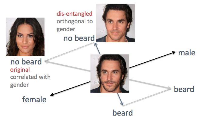 为了解决这个问题,我使用直接的线性代数 trick。具体来说,我将胡须特征轴投影到新的方向,新方向垂直于性别特征轴,这就有效去除了二者之间的关联,从而解除生成人脸图像中这两个特征的关联。