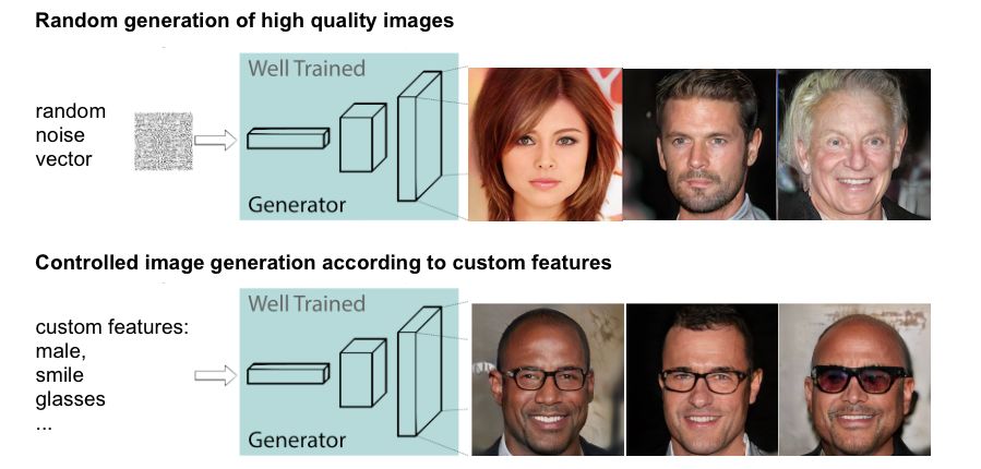 GAN 的原始版本和很多流行的模型(如 DC-GAN 和 pg-GAN)都是无监督学习模型。训练后,生成器网络将随机噪声作为输入,并生成几乎无法与训练数据集区分开来的逼真图像。然而,我们无法进一步控制生成图像的特征。但在大部分应用程序(如第一部分中描述的场景)中,用户希望生成带有自定义特征(如年龄、发色、面部表情等)的样本,而且理想情况是能够不断调整每个特征。