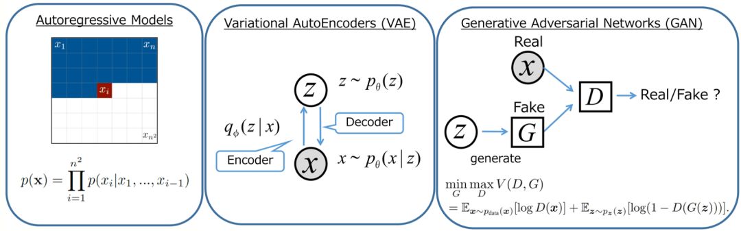 深度学习社区在生成模型方面进展迅猛。其中有三种比较有前景的模型:自回归模型,变分自编码器(VAE)和生成对抗网络(GAN),如下图所示。如果你想了解详情,可以查看这篇 OpenAI 博客: