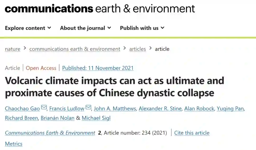 相关研究以“Volcanic climate impacts can act as ultimate and proximate causes of Chinese dynastic collapse”为题发表在最新一期的Communications Earth & Environment杂志上。