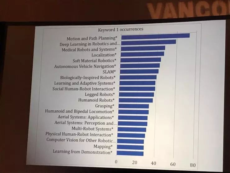 在第一天的Session中,被排在Track 1的深度学习分到了最大的分会场,能容纳400余人。但在今天晚上官方公布的关键词数据中,“Deep Learning in Robotics”(机器人中的深度学习应用)仅排在第二,排名第一的是“Motion and Path Planning”(运动与路径规划)。其他热门关键词还包括:医疗机器人、定位、软体材料机器人、无人驾驶导航、SLAM等。