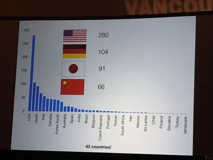 本次IROS大会共收到2164篇论文投稿,最终收录970篇,录取率44.8%。在收录论文最多的国家排名上,美国以280篇遥遥领先、德国、日本以104篇和91篇分列二、三名,中国以66篇紧随其后位列第四,其他发文数量位居前列的国家还包括:意大利、加拿大、韩国等。