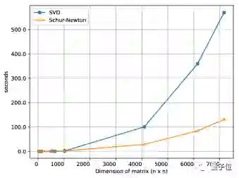 实际上,四次逆根不仅可以用SVD方法算出,也可以用舒尔-牛顿法(Schur-Newton algorithm)算出,而且随着矩阵维度的增大,后者节约的时间越来越可观。
