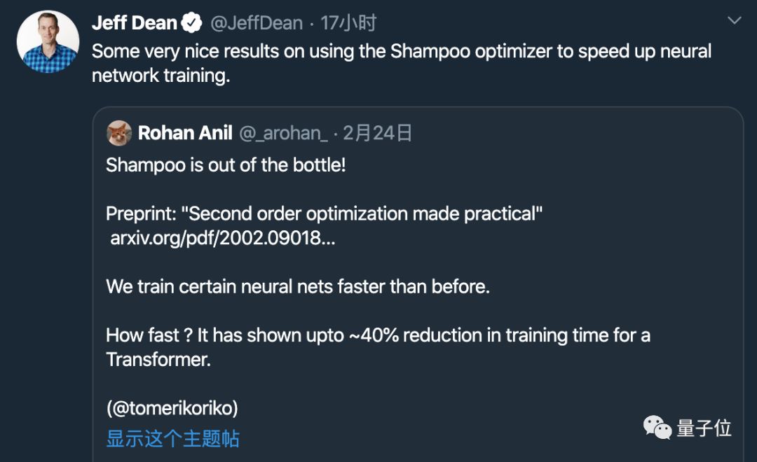 它在Transformer训练任务中比任何一阶方法都快得多,而且能达到相同甚至更高的精度。连Jeff Dean也不禁在Twitter上点赞。