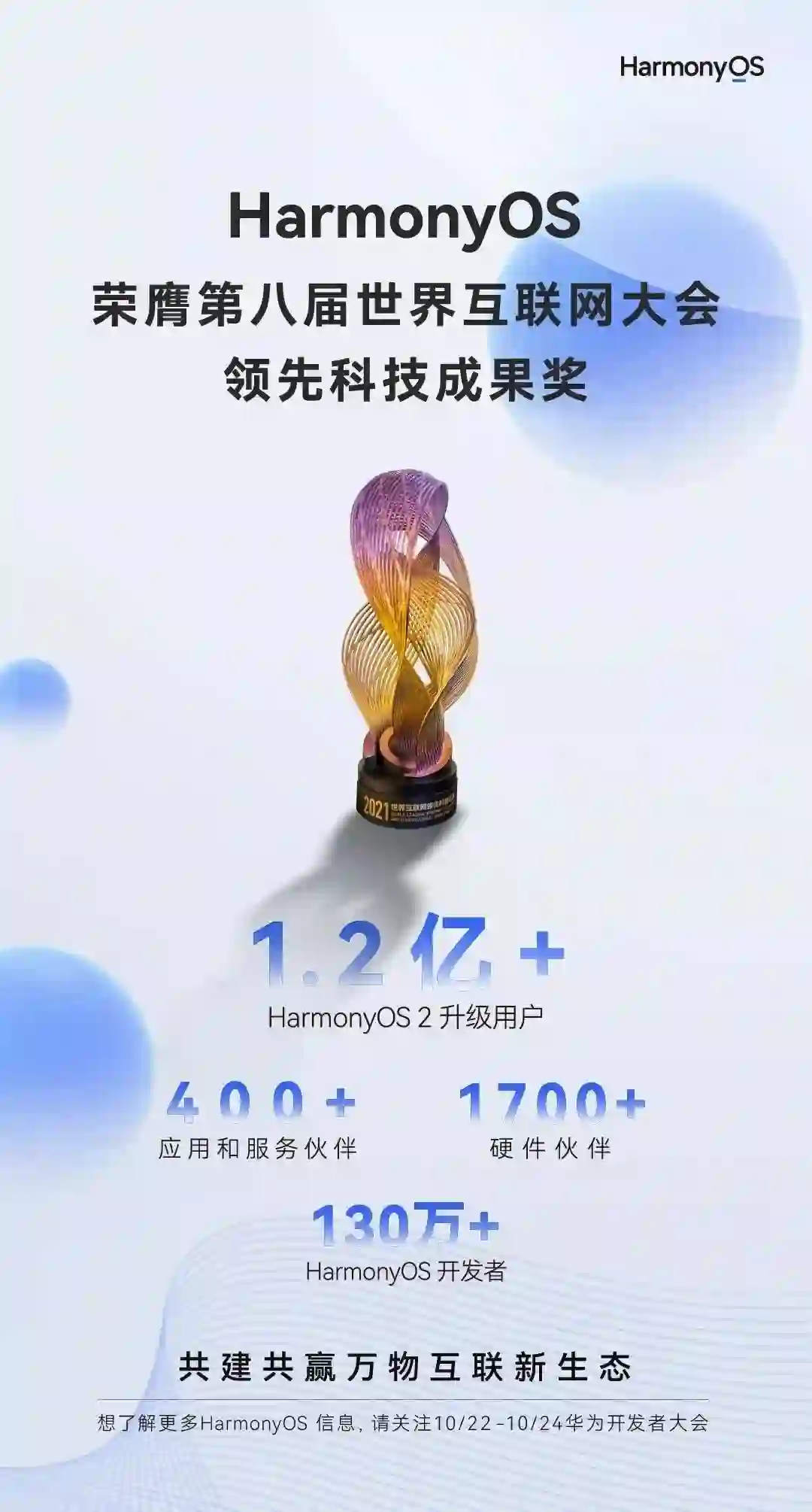 9月26日,2021 世界互联网大会在乌镇召开,华为 HarmonyOS 凭借在互联网产业创新方面发挥的积极作用,荣获领先科技成果大奖。