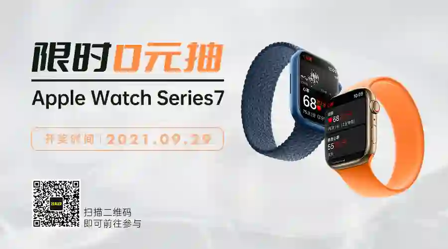 苹果新品 Apple Watch Series 7 已上线0元抽奖!边框更窄,防尘又防水的 Apple Watch Series 7体验如何?来 ZEALER App 0元试试不就知道啦,扫上方二维码或戳左下角「阅读原文」即可前往参与。