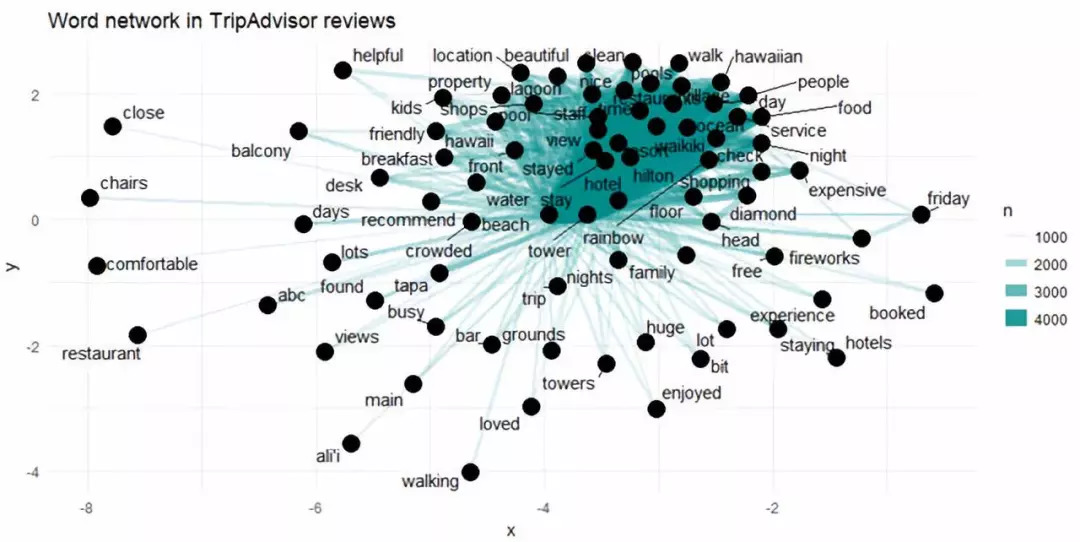 通常我们希望了解评论中单词的相互关系。哪些词组在评论文本中比较常用呢?如果给出一列单词,那么后面会随之出现什么单词呢?哪些词之间的关联性最强?许多有意思的文本挖掘都是基于这些关系的。在研究两个连续单词的时候,我们称这些单词对为“二元词组”。