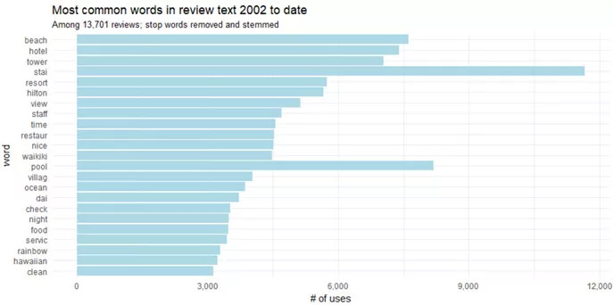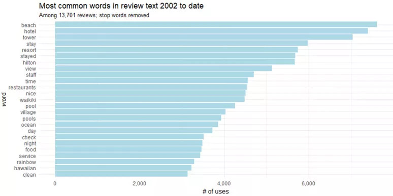 https://github.com/susanli2016/Data-Analysis-with-R/blob/master/Text%20Mining%20Hilton%20Hawaiian%20Village%20TripAdvisor%20Reviews.Rmd