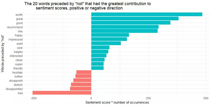 上面的分析告诉我们,在“not”后面最常见的情感词汇是“worth”,其次是“recommend”,这些词都被认为是积极词汇,而且积极程度得分为2。