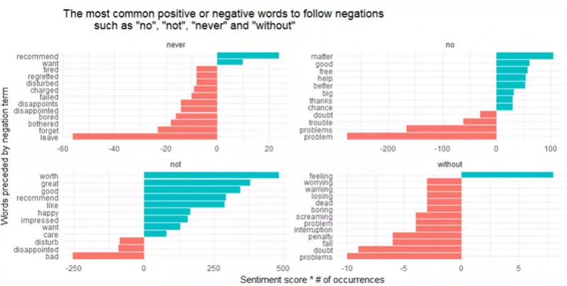 除了“not”以外,还有其他的否定词会对后面的内容进行情绪的扭转,比如“no”, “never” 和“without”。让我们来看一下具体情况。