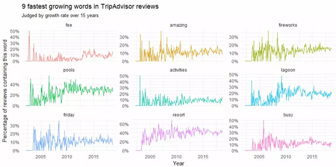 最常见的二元词组是“rainbow tower”(彩虹塔),其次是“hawaiian village”(夏威夷村)。