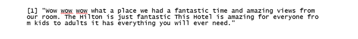 最积极的评论来自于ID为2363的记录:“哇哇哇,这地方太好了!从房间我们可以看到很漂亮的景色,我们住得很开心。Hilton酒店就是很棒!无论是小孩还是大人,这家酒店有着所有你想要的东西。”